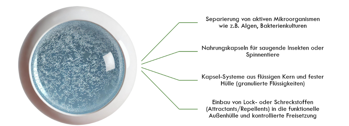 Die Möglichkeiten zur Verkapselung unterschiedlichster Substanzen gehen jedoch weit über unseren Anwendungsbereich hinaus. Der Grundaufbau der Flüssigkern-Kapseln erlaubt z.B. auch die Verwendung im Lebensmittelbereich.