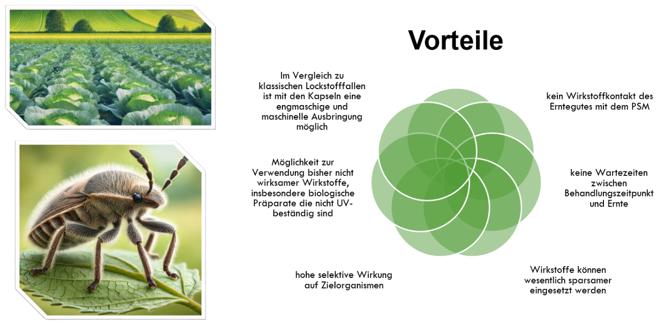 Unser neuartiges Kapsel-Systeme eignet sich im besonderen Maße zur Formulierung von biologischen und natürlichen Bekämpfungsmitteln gegen saugende Schadinsekten von Pflanzen und ermöglicht eine innovative Bekämpfungsstrategie. Die Kapseln wirken auf Wanzen anlockend und können bei Kontakt verletzen, immobilisieren oder abtöten (Attract&Kill-Prinzip). Im Ergebnis wird die Schadwirkung der Tiere erheblich reduziert. Lockstoffe, Bekämpfungsmittel, Kapselaufbau und Herstellungsverfahren müssen spezifisch für die zu bekämpfende Schädlingsart entwickelt werden. Beispielhaft ist dies zur Bekämpfung der Behaarten Wiesenwanze (Lygus rugulipennis) gelungen.