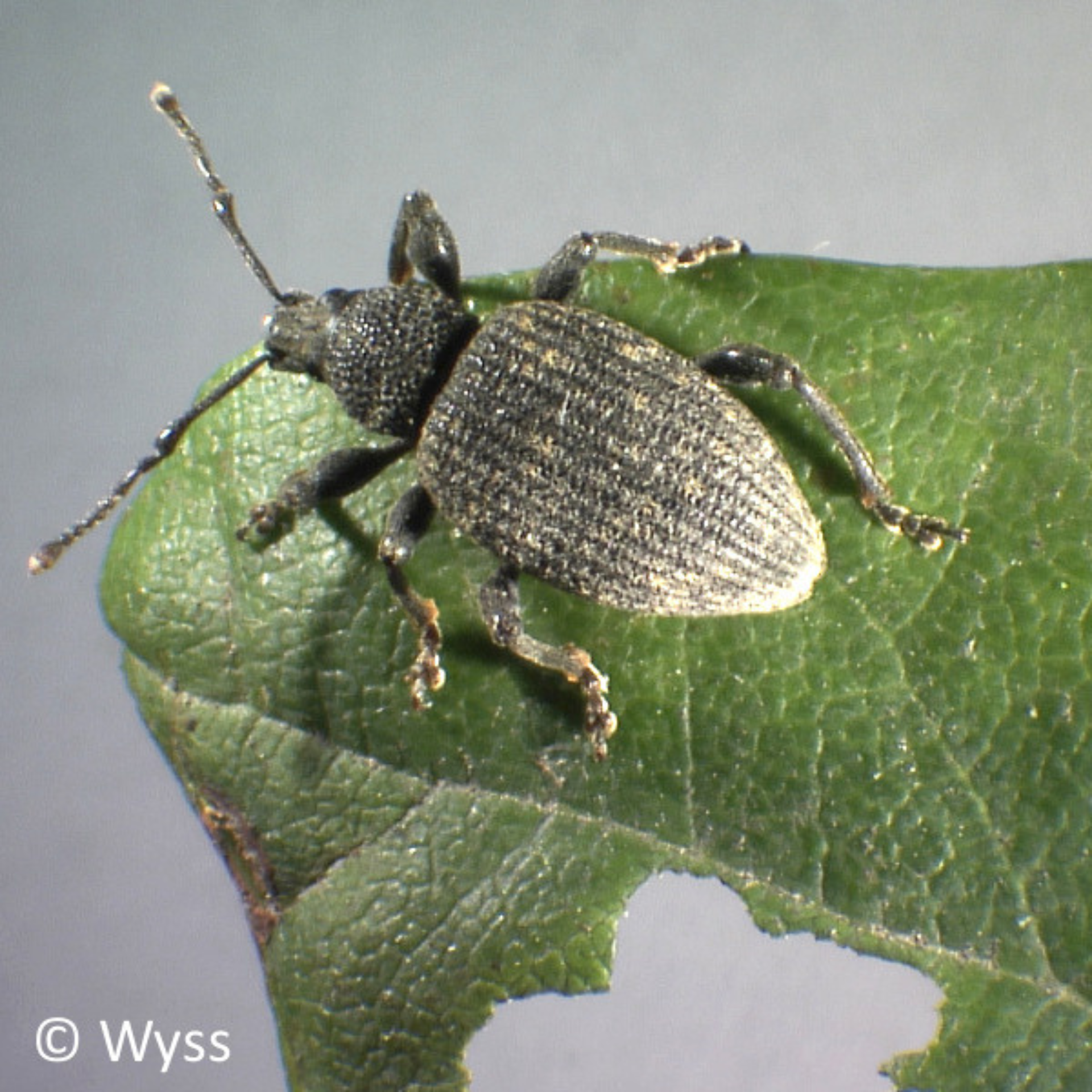 Der grauschwarze Dickmaulrüßler-Käfer ist ca. 1 cm groß. Charakteristisch ist sein dunkler Rüssel, an dessen Ende sich die Mundwerkzeuge befinden. Der Käfer kann nicht fliegen. Er lebt tagsüber versteckt und frißt nachts an den Blättern der Pflanzen.