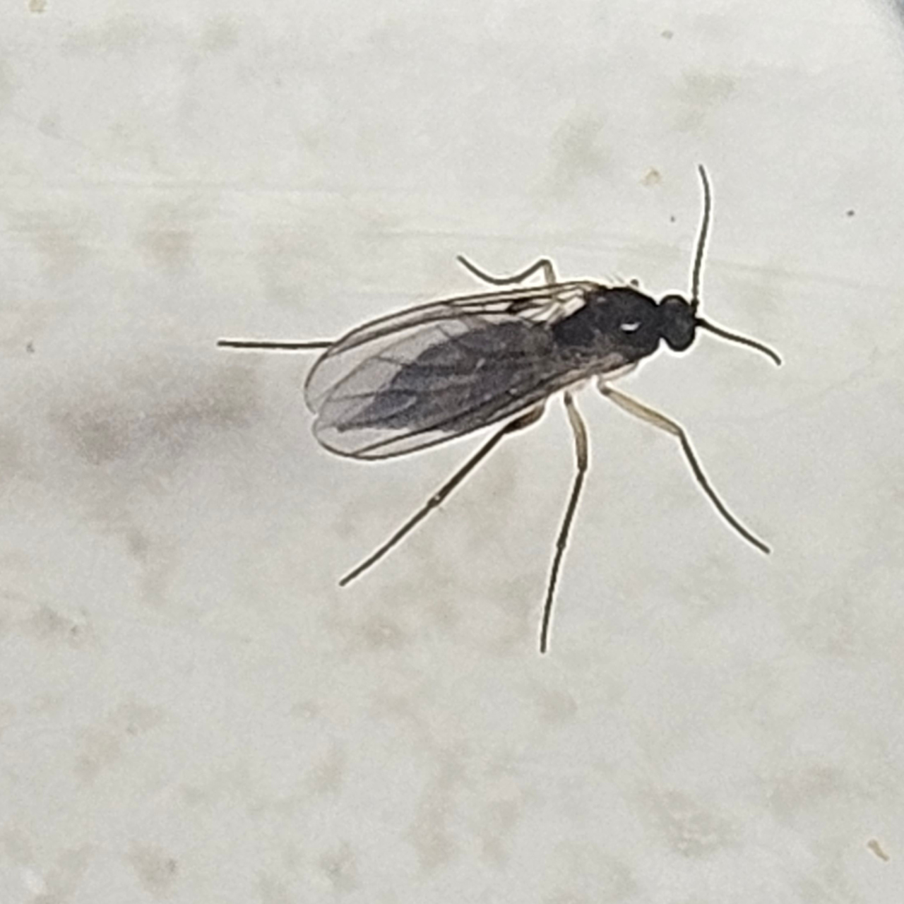 Biologie: Die etwa 2 bis 5 mm großen, dunklen Trauermücken sind sehr lebhaft. Sie legen ihre Eier in die feuchte und humose Erde. Die Larven sind 5 bis 8 mm lang, glasig-weiß und besitzen eine schwarze Kopfkapsel. Im Gewächshaus können mehrere Generationen pro Jahr auftreten. Die Larven schädigen die Pflanzen durch Fraß an Wurzeln, Sämlingen und Stecklingen. Bevorzugt werden Kulturen, an denen die Larven viel organische Substanz, Feuchtigkeit und Wärme vorfinden. Stark anfällige Kulturen sind z.B. Poinsettien und Cyclamen.